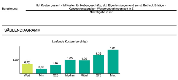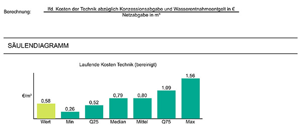 Die laufenden Kosten Technik betragen 0,58 €/m³, der Mittelwert der Vergleichsgruppe liegt bei 0,80 €/m³.