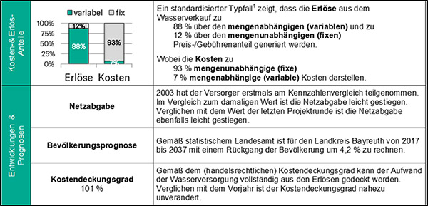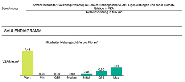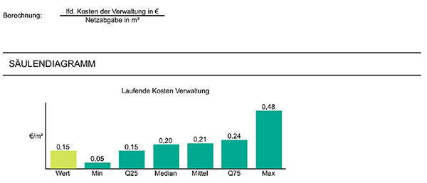 Anhand von 38 Kennzahlen, aus wesentlichen Bereichen der betrieblichen Wert-schöpfungskette, wurden Ergebnisse ermittelt und diese mit den Daten anderer Teilnehmer / Wasserversorger verglichen.
