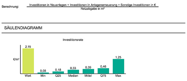 Die Investitionsrate des Unternehmens bezogen auf die Wasserabgabe betrug im Betrachtungsjahr 2,15 €/m³. Die Vergleichsunternehmen der Gruppe haben bei dieser Kennzahl einen Wert von 0,39 €/m³.