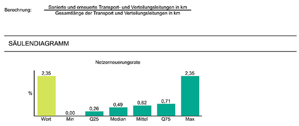 Die Sanierungs- und Erneuerungsrate (technische Substanzerhaltung) des WVU liegt mit 2,35 % über dem Mittelwert der Vergleichsgruppe (0,62 %). Der in der Praxis oftmals kommunizierte Referenzwert beträgt etwa 1,5 % des Leitungsnetzes. Gerade bei der Interpretation der Nachhaltigkeitskennzahlen ist eine regelmäßige Betrachtung über mehrere Jahre unerlässlich.