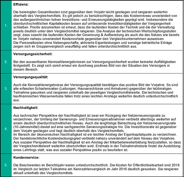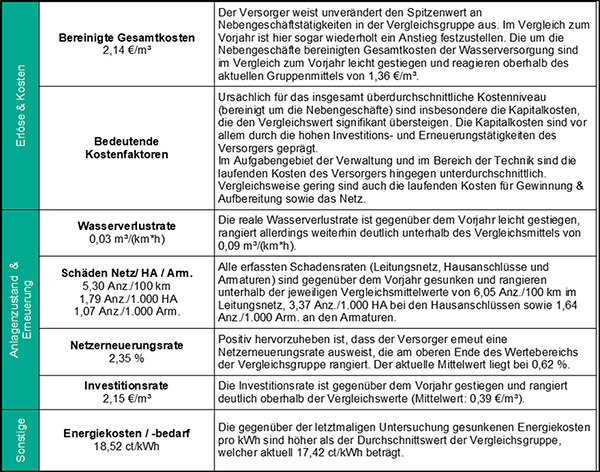 Die Ergebnisse der vergleichenden Untersuchungen mit 17 ähnlich großen Versorgern bestätigen die Qualität der Leistungserbringung, die hohe Versorgungssicherheit, die vorhandene Effizienz und den betriebswirtschaftlichen Erfolg.