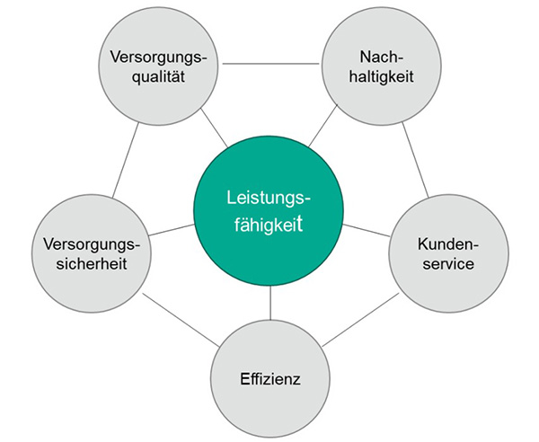 Ziel des Benchmarkings ist es, ein ganzheitliches Bild der Leistungsfähigkeit eines Wasserversorgungsunternehmens (WVU) zu gewinnen. Im Rahmen des Leistungsvergleiches erfolgt deshalb eine Betrachtung unterschiedlicher Beurteilungskriterien entlang der gesamten Wertschöpfungskette. Somit werden verschiedene Aspekte aus den Bereichen Effizienz, Versorgungssicherheit, Versorgungsqualität, Nachhaltigkeit und Kundenservice in die Betrachtung einbezogen.