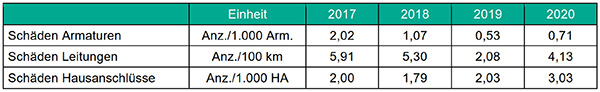 Die Anzahl der Leitungsschäden beträgt 4,13 Anz. /100 km. In der Vergleichsgruppe beträgt die durchschnittliche Schadensrate 8,69 Anz. /100 km. Die Schäden an Hausanschlüssen liegen bei 3,03 Anz. /1.000 HA, hier beträgt der Referenzwert 3,61 Anz. /1.000 HA. Die Schadensrate bei Armaturen beträgt 0,71 Anz. /1.000 Arm. (Vergleichsgruppe: 2,74 Anz. /1.000 Arm.).