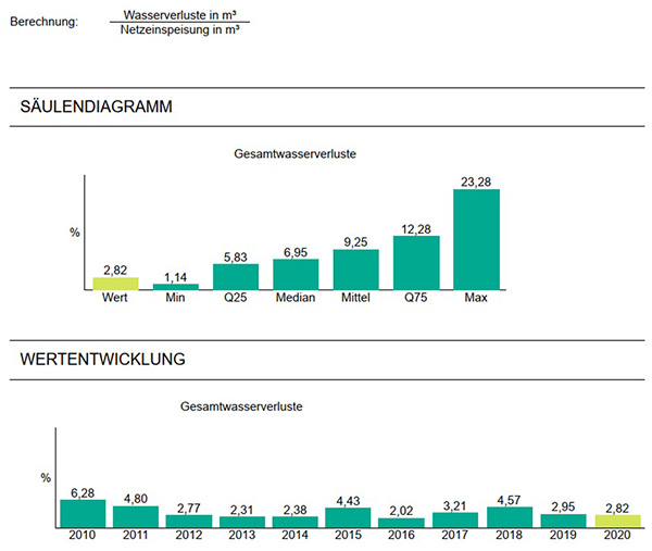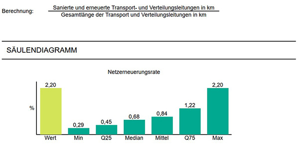 Zur Beurteilung der Qualität der Versorgung werden unter anderem Kennzahlen aus dem Bereich der Schadensstatistik (Leitungsnetz, Hausanschlüsse und Armaturen) und der Wasserverluste herangezogen. Anhand der Entwicklung im Zeitverlauf können Rückschlüsse auf mögliche Optimierungspotentiale sowie auf die Wirksamkeit durchgeführter Erneuerungsmaßnahmen gezogen werden.