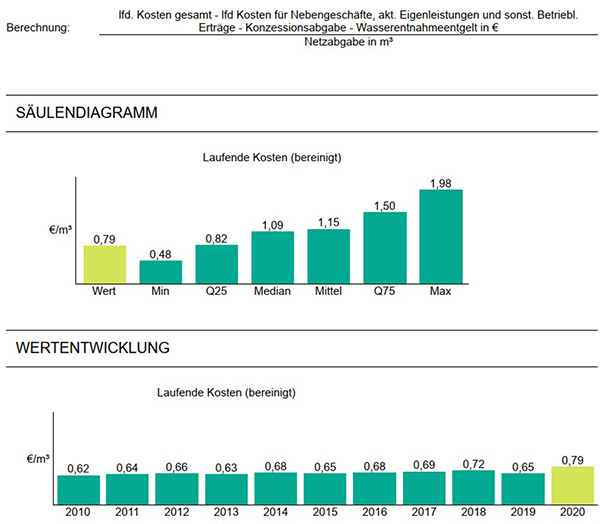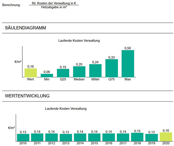 Eine unmittelbare Aussage über die Leistungsfähigkeit eines Unternehmens lässt sich daraus nicht ableiten. In unserem Fall liegen die Kapitalkosten mit 1,47 €/m³ (Vj. 1,44 €/m³), bedingt durch die hohen Abschreibungen (mit 1.720.548,01 €), über dem Mittelwert der Vergleichsgruppe (0,45 €/m³).