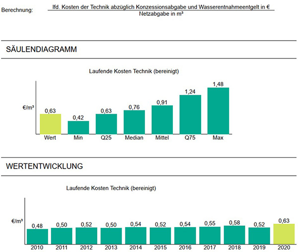 Die laufenden Kosten Technik betragen 0,63 €/m³ (Vj. 0,52 €/m³), der Mittelwert der Vergleichsgruppe liegt bei 0,91 €/m³ (Vj. 0,85 €/m³).