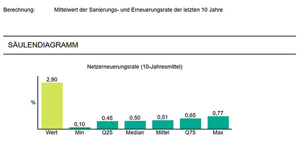 Im Durchschnitt der letzten 10 Jahre erreicht die Juragruppe eine Netzerneuerungsrate von 2,9 %. Der Mittelwert der Vergleichsgruppe hat eine Netzerneuerungsrate von 0,54 %.
