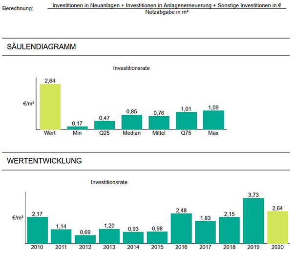 Die Investitionsrate des Unternehmens bezogen auf die Wasserabgabe betrug im Betrachtungsjahr 2,64 €/m³ (Vj. 3,73 €/m³). Die Vergleichsunternehmen der Gruppe haben bei dieser Kennzahl einen Wert von 0,76 €/m³ (Vj. 0,48 €/m³).