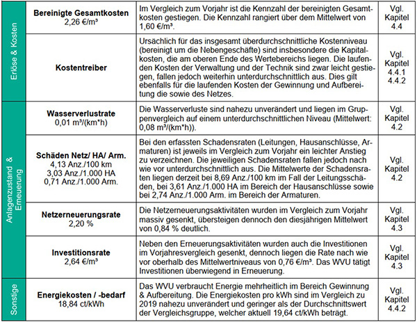 Die Gesamtkosten liegen mit 3,03 €/m³ über den Mittelwert der Vergleichsgruppe mit 1,82 €/m³. Für diesen Vergleich müssen jedoch aufgrund der regen Nebentätigkeit die Gesamtkosten um die Kosten für die Nebengeschäfte und die aktivierten Eigenleistungen bereinigt werden. Nach Rödl & Partner betragen die bereinigten Gesamtkosten inkl. Abschreibung 2,26 €/m³ (Vj. 2,09 €/m³), Vergleichsgruppe 1,60 €/m³ (Vj. 1,42 €/m³).