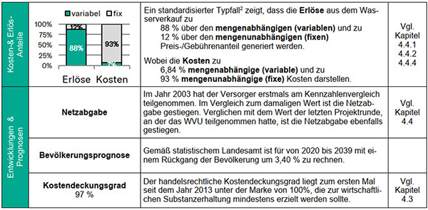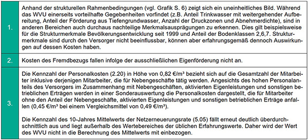 Bei Wasserversorgungsunternehmen werden die Gesamtkosten auch maßgeblich durch die Kapitalkosten beeinflusst. Diese Kosten sind erfahrungsgemäß nicht bzw. nur langfristig zu beeinflussen und sind häufig auf Entscheidungen der Vergangenheit zurückzuführen, die sich nachhaltig auf die Finanzsituation des Unternehmens auswirken.