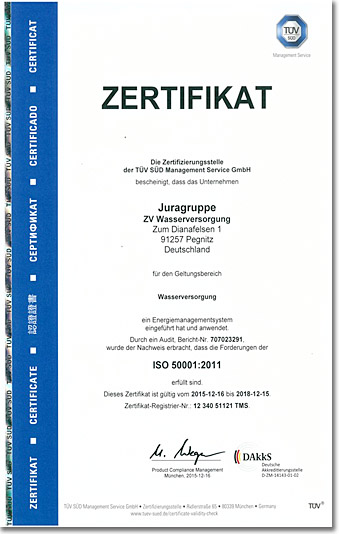 Mit dem ISO 50001 Prüfzertifikat demonstriert die Juragruppe ZV Wasserversorgung der Öffentlichkeit Ihr Energiebewusstsein. Dies trägt entscheidend zum positiven Image des Unternehmens bei.