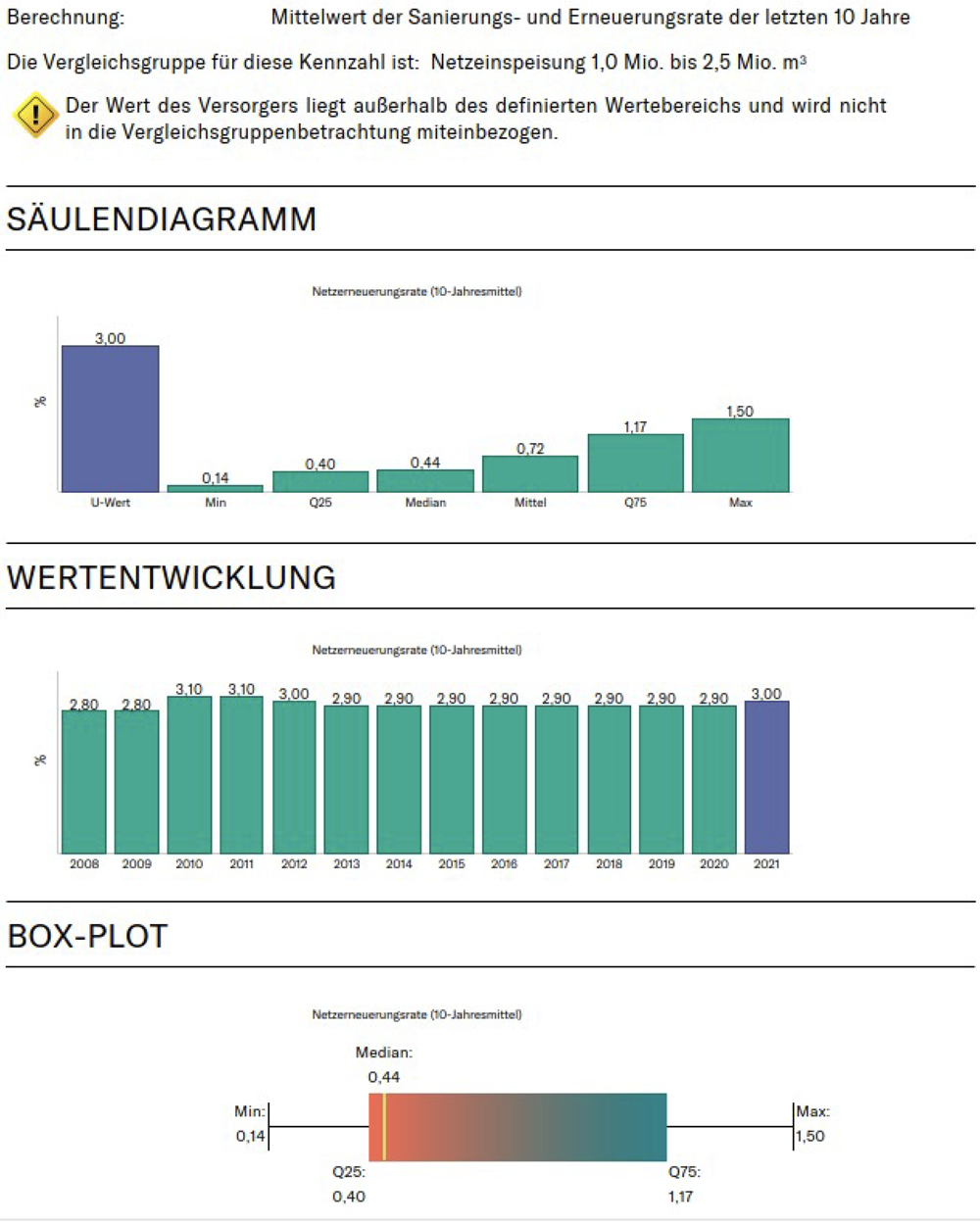 Wir haben mittlerweile die höchste Netzerneuerungsrate mit 2,9 % p. a. im Zehnjahresdurchschnitt und mit 2,31 % die niedrigste Wasserverlustrate, was sicherlich durch die überdurchschnittliche Netzerneuerungsrate bedingt ist und zu niedrigeren Schadensbehebungskosten geführt hat.