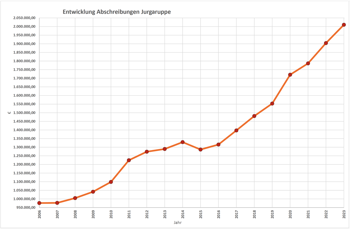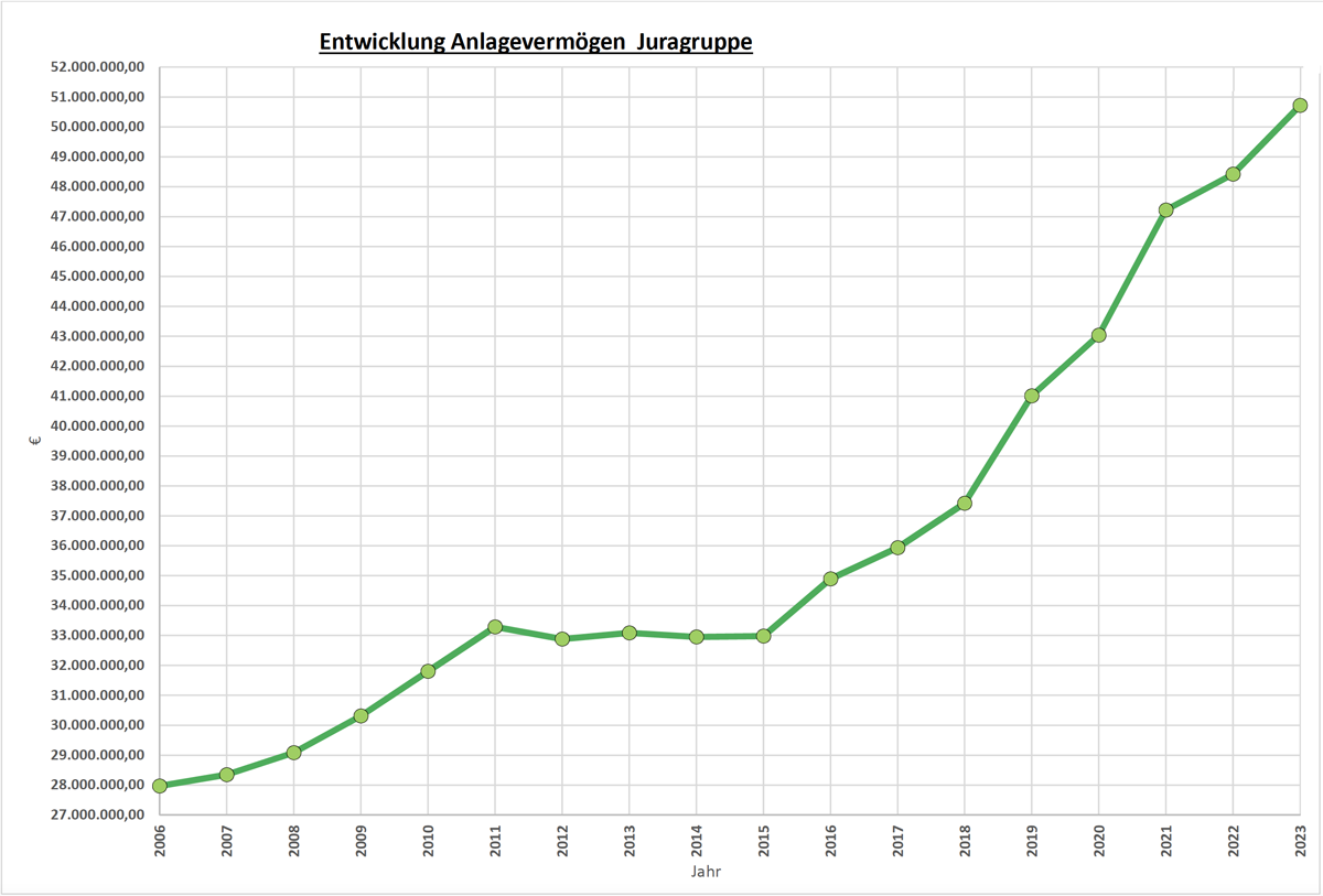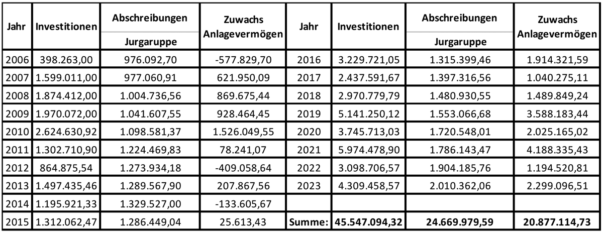 Diese durchschnittliche Investitionsrate von 1,84 € p.a. führt bei der Juragruppe zu einem Gesamtinvestitionsvolumen von 45.547.094,32 € in den Jahren 2006-2023, was aus der nachfolgenden Tabelle entnommen werden kann.