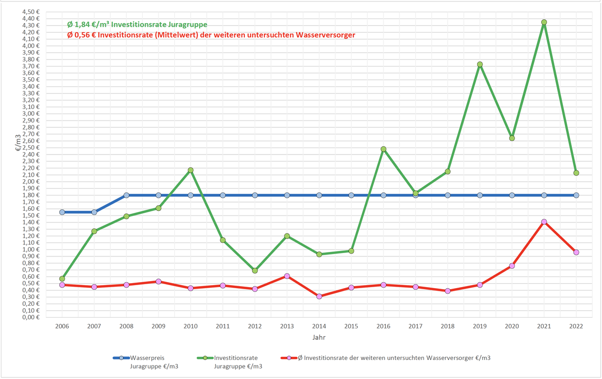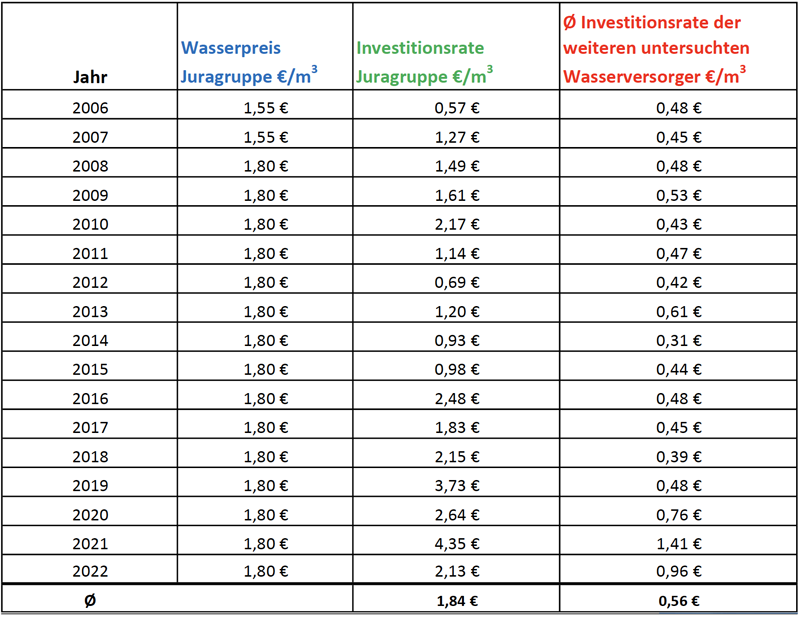 In einer Anlage 1 hat der Werkleiter die jährlichen Investitionsraten der Juragruppe ZV Wasserversorgung pro m³ in Relation zum Wasserpreis gesetzt. Er hat diese Investitionsraten auch mit denen in der Vergleichsgruppe befindliche Wasserversorgern des Bayerischen Benchmarkingprojekts verglichen.