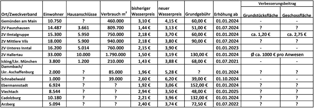 Informativ wurden durch den Werkleiter der Juragruppe ZV Wasserversorgung in den Medien dargestellte Wasserpreiserhöhungsvorgänge bei div. Wasserversorgern betrachtet, um perspektivisch bewerten zu können, ob solche Szenarien für die Zukunft bei der Juragruppe ZV Wasserversorgung ebenfalls zu erwarten sind.