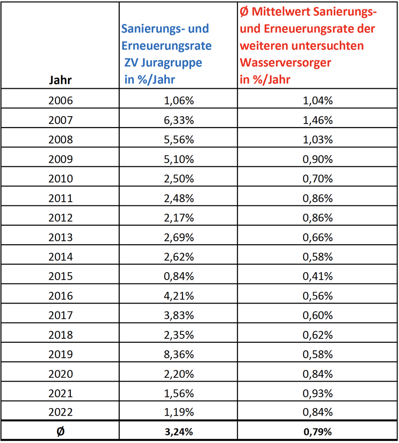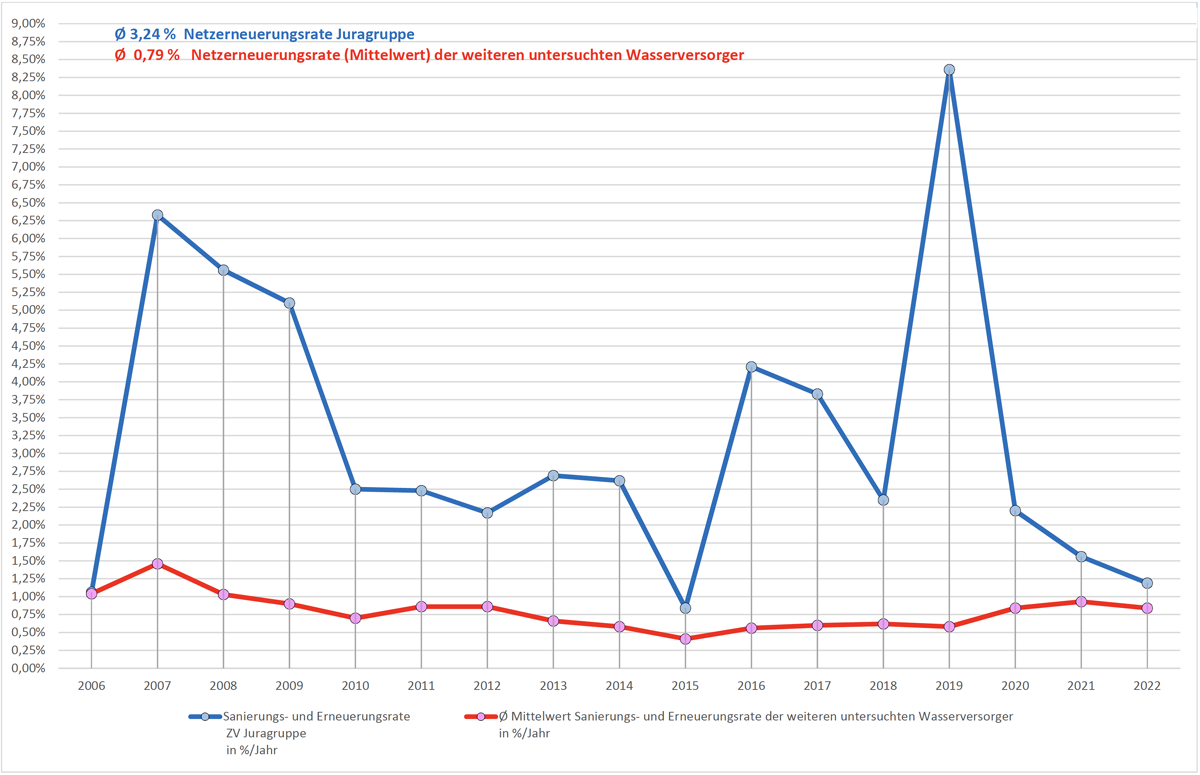 Hier hat die Juragruppe ZV Wasserversorgung eine durchschnittliche Netzerneuerungsrate von jährlich 3,24 % und die durchschnittliche Vergleichsgruppe eine von 0,79 %.